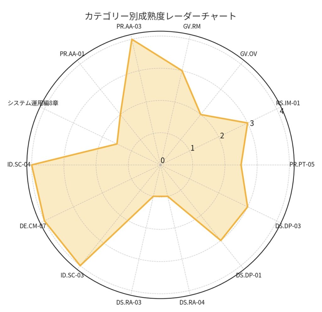 • 出力:成熟度スコア(0〜4)、改善提案、未達一覧、レポート生成(Word/PDF)